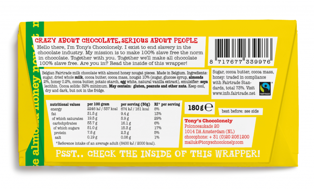 Tony's Chocolonely Milk Almond Honey Nougat Bar 32%, 180g pop