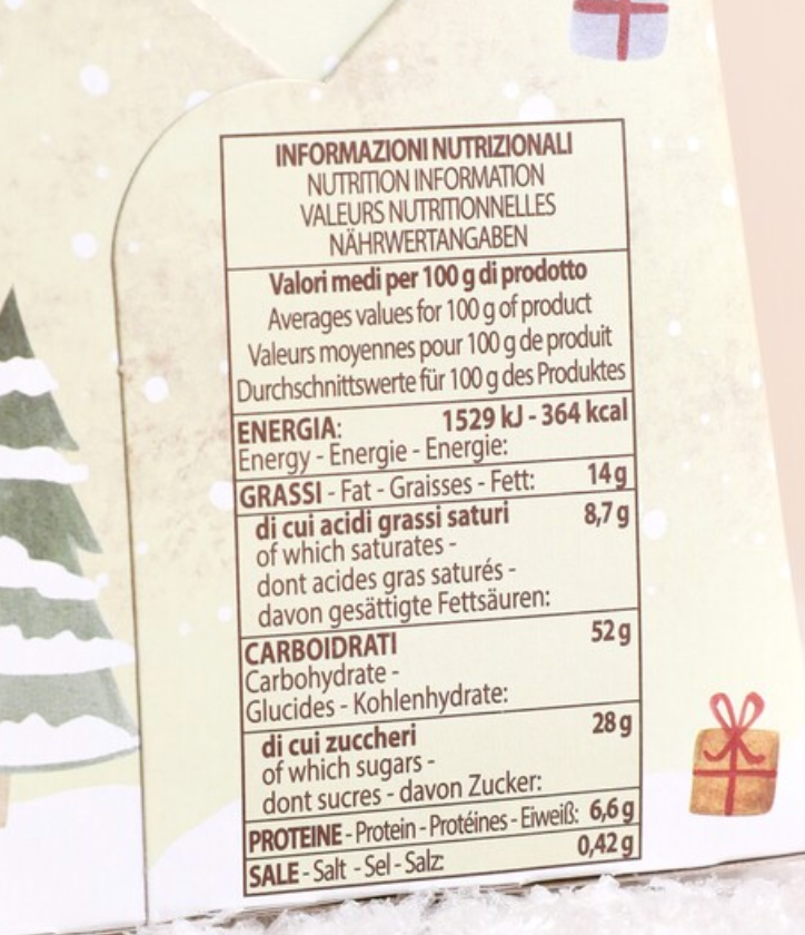 WHEAT FLOUR - sultanas 18% - whole EGGS - sugar - butter (MILK) - candied orange peels 4% (orange peels, glucose-fructose syrup, sugar) - MILK - natural yeast (WHEAT FLOUR, water) - emulsifiers: mono-diglycerides of fatty acids - fructose - salt - beer yeast - natural flavourings. It may contain traces of HAZELNUTS, ALMONDS, SOYA, PISTACHIOS and MUSTARD. Store in a cool dry place
